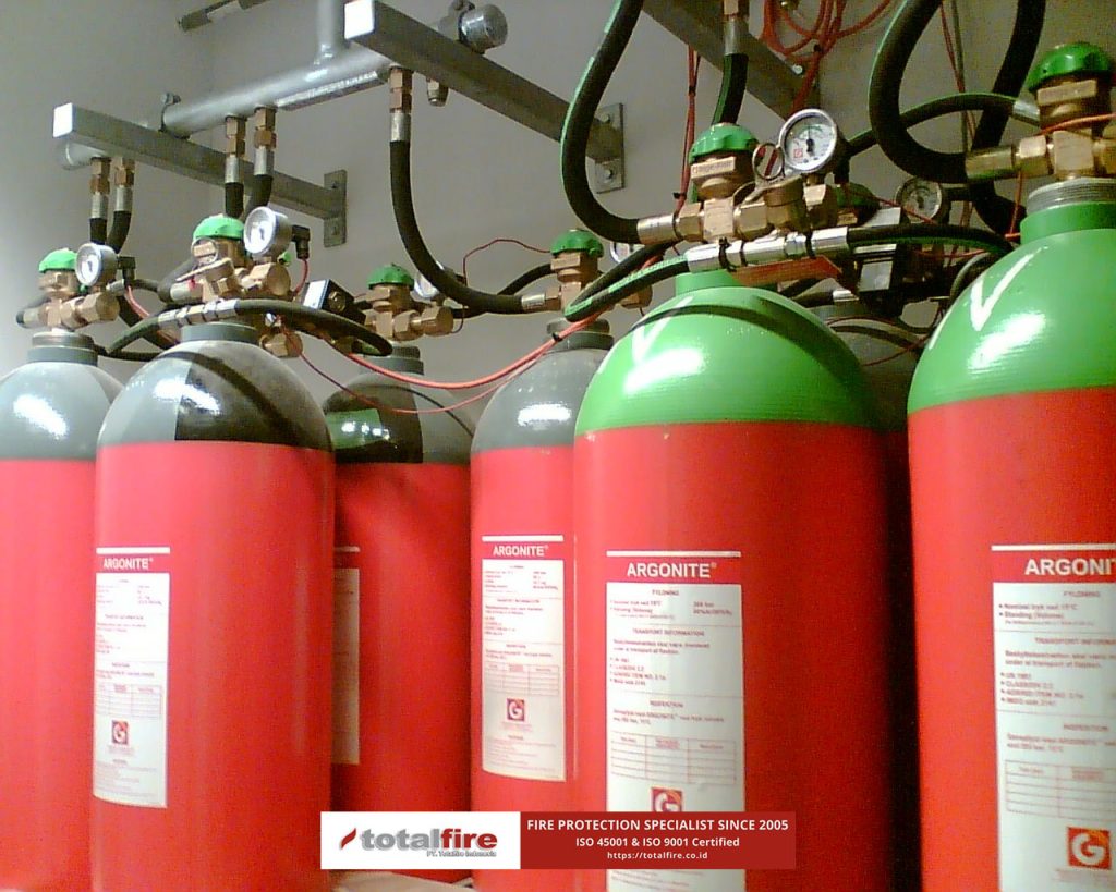 - Inert Gas (Inergen): Campuran gas alami (Nitrogen, Argon, CO₂) yang memadamkan api dengan menurunkan kadar oksigen di bawah level pembakaran, dan dirancang agar tetap aman bagi manusia selama berada dalam konsentrasi desain yang sesuai standar.