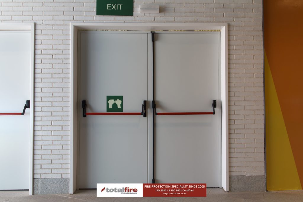 - Panic Bar (Push Bar): Pintu darurat harus dilengkapi dengan panic bar yang memungkinkan pintu terbuka seketika hanya dengan dorongan badan, tanpa perlu memutar kunci atau gagang pintu.